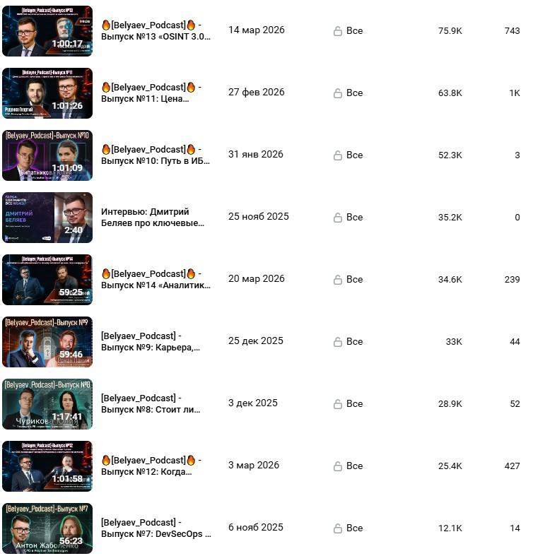 Belyaev_Podcast — это уникальное личное медиа в кибербезопасности, где признанный лидер российской ИБ‑сцены Дмитрий Беляев с 11+ годами практики в топ‑компаниях и десятками публичных выступлений собирает гостей экстра‑класса, чтобы на языке живых историй разбирать реальные кейсы и «человеческую сторону» безопасности, усиливая эффект фирменной Blitz‑игрой, мультиплатформенным присутствием и выпуском, который стабильно набирает десятки тысяч просмотров и даёт экспертам редкую возможность говорить с рынком напрямую без пиара и цензуры